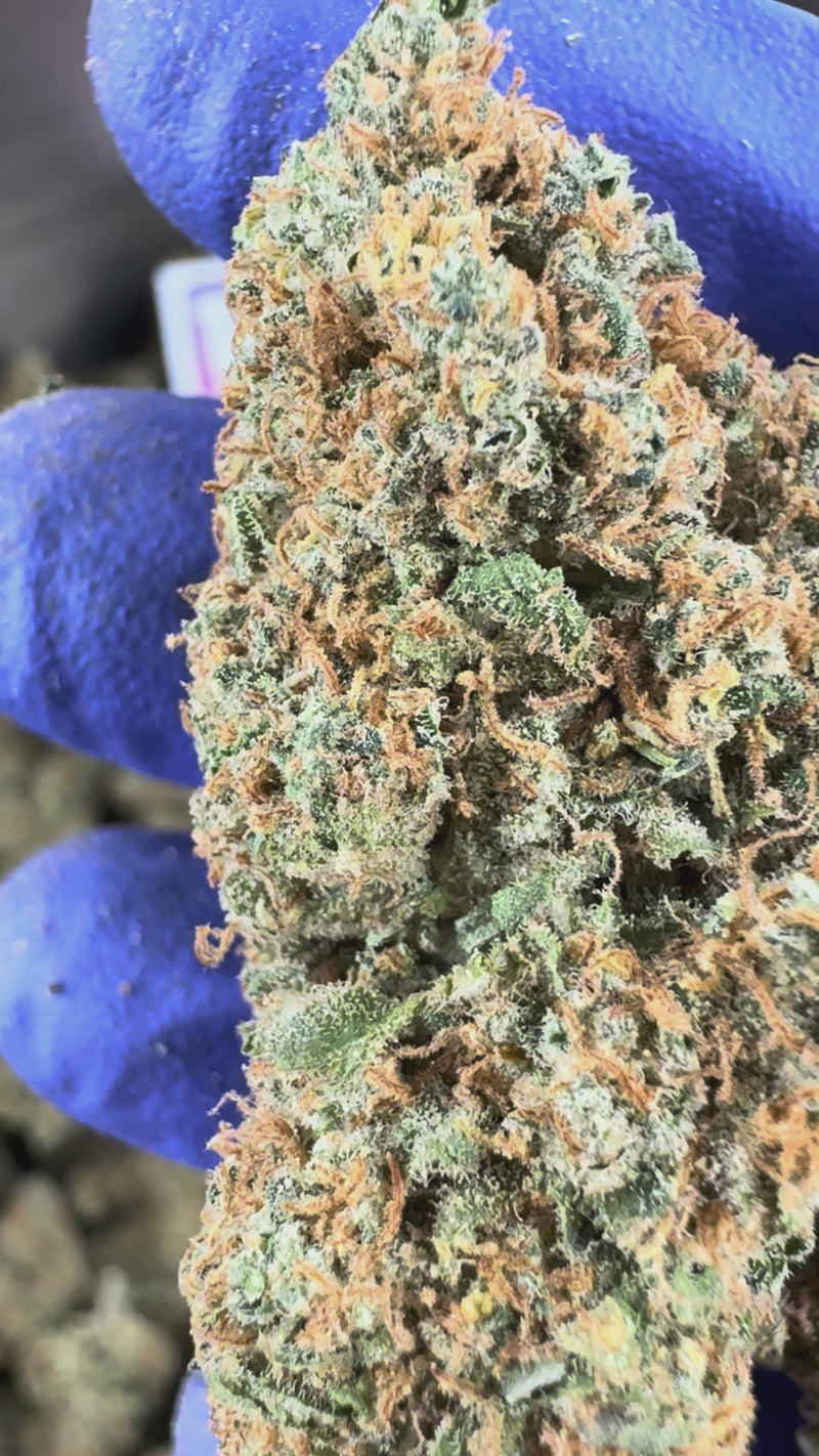 On découvre ici un visuel typique d’une Blueberry Muffin, de belles buds bien compactes parsemées d’un large manteau de pistils d’un orange très vif. Un vert saisissant avec un aspect “givré” dû à une grande présence de trichomes gorgés de pollen vient sublimer les fleurs.